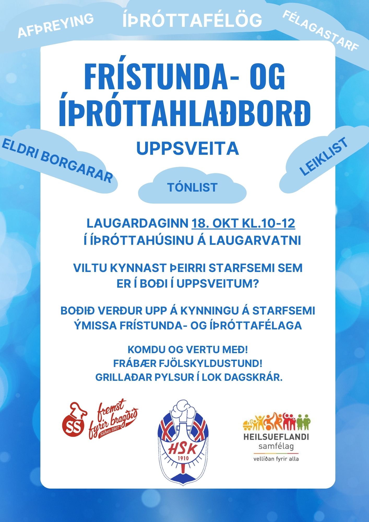 Laugardaginn 18. október kl. 10-12:00 verður frístunda- og íþróttahlaðborð í íþróttahúsinu á Laugarvatni, þar sem íþróttafélög og félagasamtök í uppsveitum Árnessýslu sameinast og kynna starfsemi sína. Viðburðurinn er opinn öllum og hvetjum við fjölskyldur til að mæta á Laugarvatn og kynna sér það fjölbreytta starf sem finna má í Uppsveitunum. Boðið verður upp á grillaðar pylsur í lok dagskrár. Það eru heilsueflandi uppsveitir, í samstarfi við svæðisskrifstofu íþróttahéraða og HSK, sem bjóða í hlaðborðið.